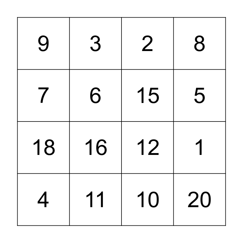 This bingo card has a free space and 15 words: 4, 20, 2, 9, 5, 7, 16, 10, 6, 18, 1, 8, 15, 3 and 11.
