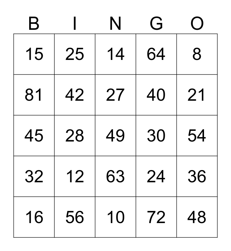 This bingo card has 25 words: 12, 10, 27, 16, 8, 15, 81, 25, 30, 63, 40, 45, 24, 36, 42, 48, 54, 14, 21, 28, 49, 56, 32, 64 and 72.