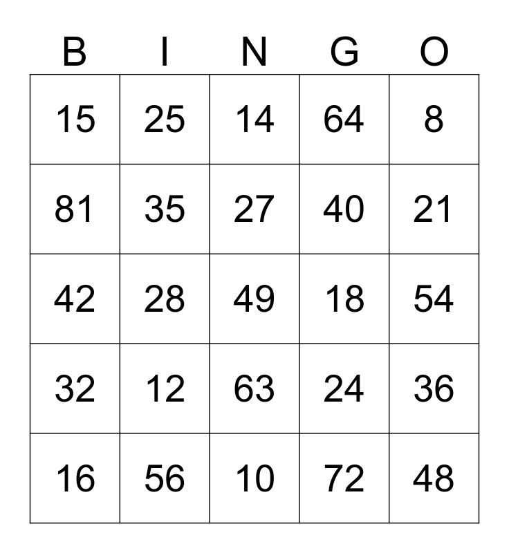 This bingo card has 25 words: 12, 10, 27, 16, 8, 15, 81, 25, 18, 63, 40, 42, 24, 36, 35, 48, 54, 14, 21, 28, 49, 56, 32, 64 and 72.