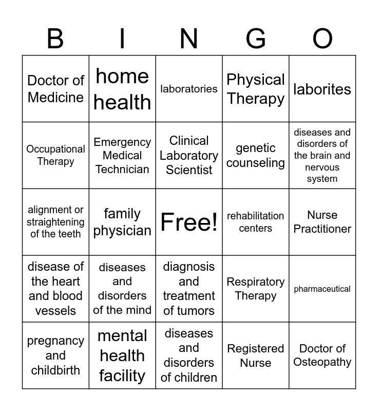 This bingo card has a free space and 24 words: diseases and disorders of the mind, mental health facility, Clinical Laboratory Scientist, pregnancy and childbirth, laborites, Doctor of Medicine, Occupational Therapy, home health, rehabilitation centers, diagnosis and treatment of tumors, genetic counseling, alignment or straightening of the teeth, Respiratory Therapy, pharmaceutical, Emergency Medical Technician, Registered Nurse, Nurse Practitioner, laboratories, diseases and disorders of the brain and nervous system, family physician, Doctor of Osteopathy, disease of the heart and blood vessels, Physical Therapy and diseases and disorders of children.