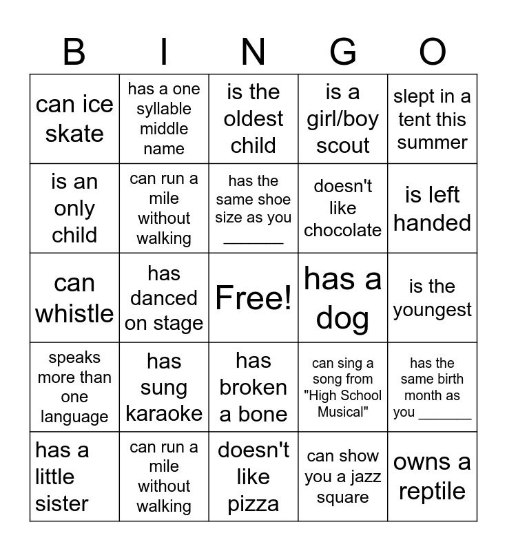 This bingo card has a free space and 29 words: has a little sister, plays an instrument, has danced on stage, had stitches, can ice skate, is the oldest child, can run a mile without walking, has sung karaoke, has a dog, can run a mile without walking, is the youngest, owns a reptile, doesn't like pizza, can show you a jazz square, is left handed, has a cat, has broken a bone, speaks more than one language, slept in a tent this summer, can whistle, can sing a song from "High School Musical", can sing a Taylor Swift song, doesn't like chocolate, is an only child, is a girl/boy scout, has a one syllable middle name, has the same birth month as you _______, has the same shoe size as you _______ and is an aunt/uncle.