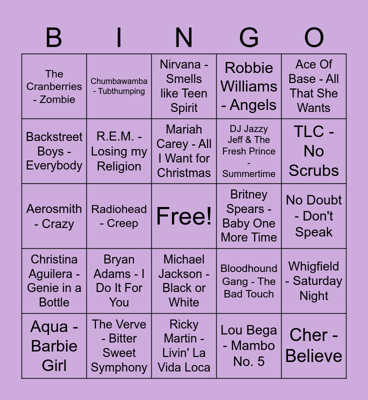 This bingo card has a free space and 29 words: Aqua - Barbie Girl, Shania Twain - Man! I Feel Like A Woman, Radiohead - Creep, Oasis - Wonderwall, The Cranberries - Zombie, Nirvana - Smells like Teen Spirit, R.E.M. - Losing my Religion, Bryan Adams - I Do It For You, Britney Spears - Baby One More Time, The Verve - Bitter Sweet Symphony, No Doubt - Don't Speak, Cher - Believe, Ricky Martin - Livin' La Vida Loca, Lou Bega - Mambo No. 5, TLC - No Scrubs, Spice Girls - Wannabe, Michael Jackson - Black or White, Christina Aguilera - Genie in a Bottle, Ace Of Base - All That She Wants, Aerosmith - Crazy, Bloodhound Gang - The Bad Touch, Natalie Imbruglia - Torn, DJ Jazzy Jeff & The Fresh Prince - Summertime, Backstreet Boys - Everybody, Robbie Williams - Angels, Chumbawamba - Tubthumping, Whigfield - Saturday Night, Mariah Carey - All I Want for Christmas and Take That - Back for Good.