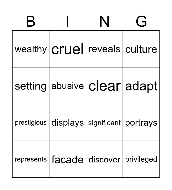 This bingo card has 25 words: genuine, authentic, adapt, conform, setting, wealthy, abusive, cruel, facade, imposter, prestigious, significant, establishes, identity, clear, corrupt, discover, reveals, displays, portrays, represents, juxtaposing, privileged, culture and class.