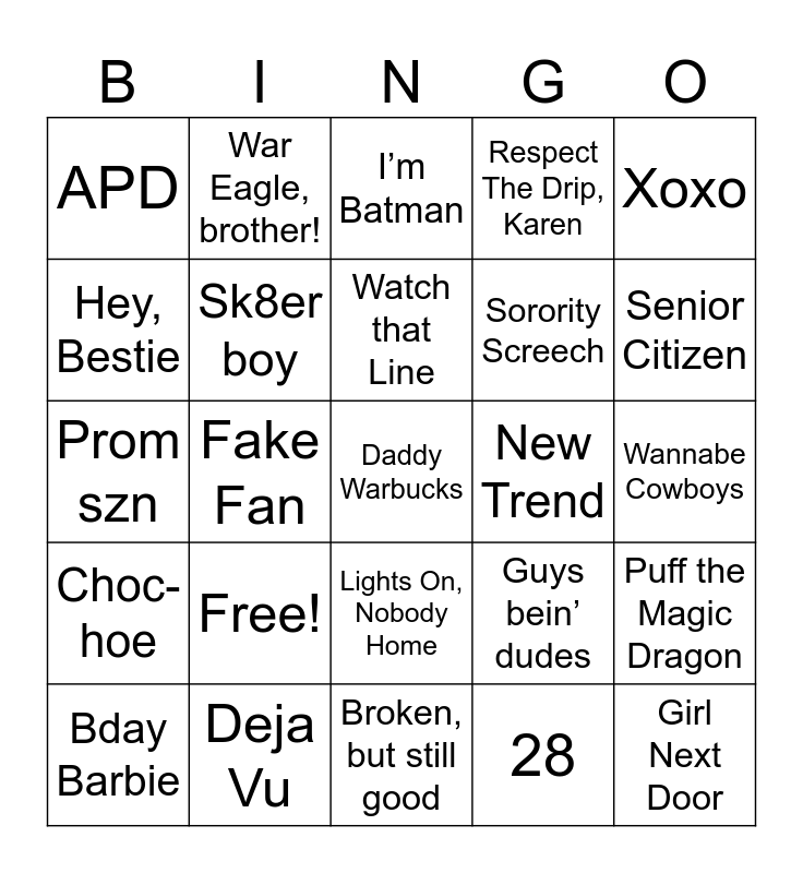 This bingo card has 25 words: Free!, Broken, but still good, Watch that Line, Bday Barbie, Xoxo, APD, Hey, Bestie, War Eagle, brother!, New Trend, Lights On, Nobody Home, Sorority Screech, Prom szn, Guys bein’ dudes, Puff the Magic Dragon, Sk8er boy, Girl Next Door, Wannabe Cowboys, I’m Batman, Senior Citizen, Fake Fan, Daddy Warbucks, Deja Vu, Choc-hoe, Respect The Drip, Karen and 28.