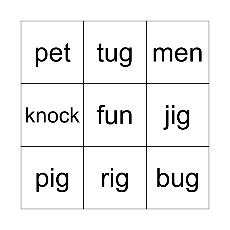 This bingo card has a free space and 17 words: top, hot, men, pet, cut, knock, skip, pig, rig, jig, cat, hat, bug, tug, bus, jam and hen.