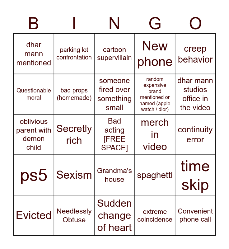This bingo card has 38 words: dhar mann voiceover, dhar car, "you see" / "so you see", merch in video, time skip, ps5, bad props (homemade), flashback, random expensive brand mentioned or named (apple watch / dior), dhar mann studios office in the video, Questionable moral, parking lot confrontation, Bad acting [FREE SPACE], spaghetti, creep behavior, oblivious parent with demon child, kids with ipad, cartoon supervillain, "it's like ____ always says...", continuity error, dhar mann mentioned, Needlessly Obtuse, someone fired over something small, extreme coincidence, unreasonable mom, chill dad, bad voice dubbing, Emotional monologue, Sudden change of heart, Overly forgiving, Kids have tests/Exam, Classism, Sexism, Grandma's house, New phone, Convenient phone call, Evicted, Secretly rich and Credit card declined.