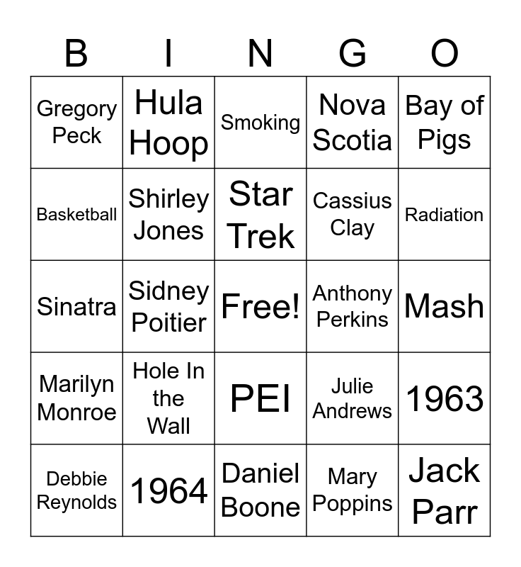 This bingo card has a free space and 35 words: 6, Alice, Bus, Shirley Jones, PEI, Nova Scotia, Basketball, Three Stooges, Star Trek, Nixon, Sinatra, Bay of Pigs, Martin Luther King Jr., The Apartment, Gregory Peck, Anthony Perkins, Mary Poppins, Sidney Poitier, Marilyn Monroe, Jack Parr, Julie Andrews, Debbie Reynolds, 1963, 1964, Smoking, Radiation, Harper Lee, Slyvia Path, Cassius Clay, Mash, Davy Crockett, Daniel Boone, Hole In the Wall, Hula Hoop and Sputnik.