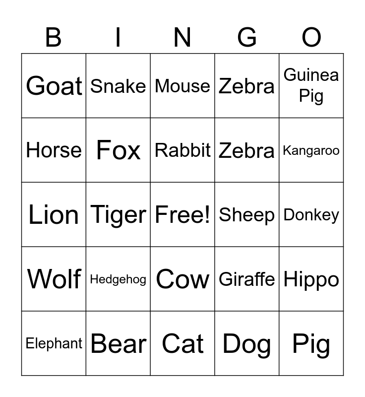 This bingo card has a free space and 24 words: Hedgehog, Bear, Rabbit, Elephant, Guinea Pig, Goat, Horse, Snake, Sheep, Cow, Zebra, Lion, Giraffe, Hippo, Fox, Dog, Donkey, Mouse, Kangaroo, Tiger, Pig, Wolf, Zebra and Cat.