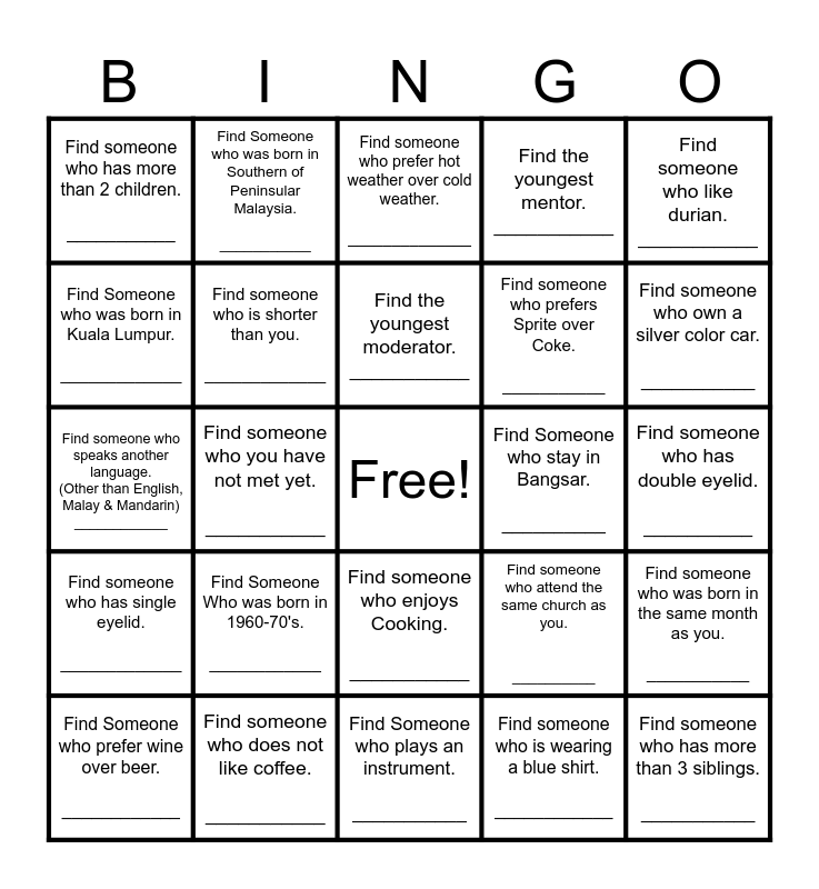 This bingo card has a free space and 25 words: Find Someone Who was born in 1960-70's. ____________, Find Someone who plays an instrument. ___________, Find the youngest moderator. ___________, Find Someone who prefer wine over beer. ____________, Find someone who like durian. ___________, Find someone who has more than 2 children. ___________, Find Someone who was born in Kuala Lumpur. _____________, Find Someone who was born in Southern of Peninsular Malaysia. ___________, Find Someone who stay in Bangsar. __________, Find someone who enjoys Cooking. ___________, Find someone who prefers Sprite over Coke. ___________, Find someone who speaks another language. (Other than English, Malay & Mandarin) ____________, Find someone who attend the same church as you. __________, Find someone who was born in the same month as you. ___________, Find someone who is shorter than you. _____________, Find someone who like hiking. ___________, Find someone who has double eyelid. __________, Find someone who prefer hot weather over cold weather. ______________, Find someone who own a silver color car. ___________, Find someone who you have not met yet. ___________, Find someone who has more than 3 siblings. ___________, Find someone who does not like coffee. ___________, Find someone who has single eyelid. _____________, Find the youngest mentor. ___________ and Find someone who is wearing a blue shirt. ____________.