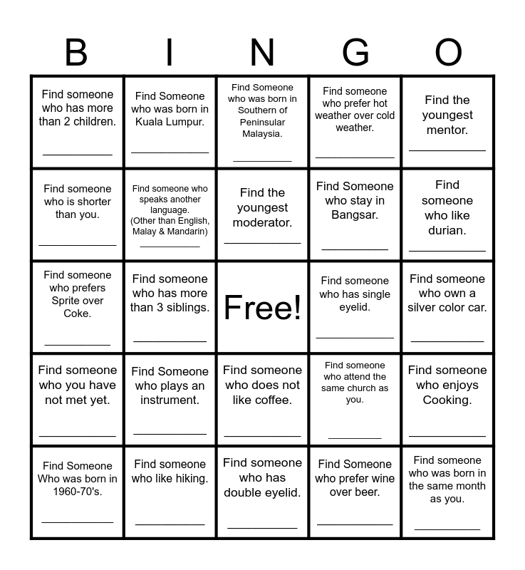 This bingo card has a free space and 25 words: Find Someone Who was born in 1960-70's. ____________, Find Someone who plays an instrument. ___________, Find the youngest moderator. ___________, Find Someone who prefer wine over beer. ____________, Find someone who like durian. ___________, Find someone who has more than 2 children. ___________, Find Someone who was born in Kuala Lumpur. _____________, Find Someone who was born in Southern of Peninsular Malaysia. ___________, Find Someone who stay in Bangsar. __________, Find someone who enjoys Cooking. ___________, Find someone who prefers Sprite over Coke. ___________, Find someone who speaks another language. (Other than English, Malay & Mandarin) ____________, Find someone who attend the same church as you. __________, Find someone who was born in the same month as you. ___________, Find someone who is shorter than you. _____________, Find someone who like hiking. ___________, Find someone who has double eyelid. __________, Find someone who prefer hot weather over cold weather. ______________, Find someone who own a silver color car. ___________, Find someone who you have not met yet. ___________, Find someone who has more than 3 siblings. ___________, Find someone who does not like coffee. ___________, Find someone who has single eyelid. _____________, Find the youngest mentor. ___________ and . ____________.