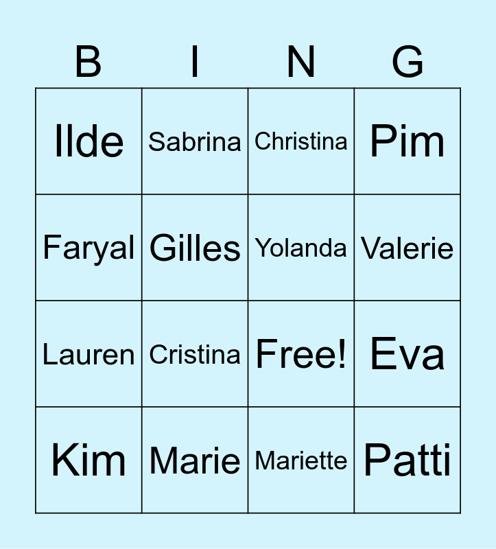 This bingo card has 19 words: Free!, Golaleh, Christina, Patti, Eva, Faryal, Mariette, Ilde, Sabrina, Lauren, Cristina, Gilles, Yolanda, Marie, Kim, Willemijn, Pim, Valerie and Nuria.