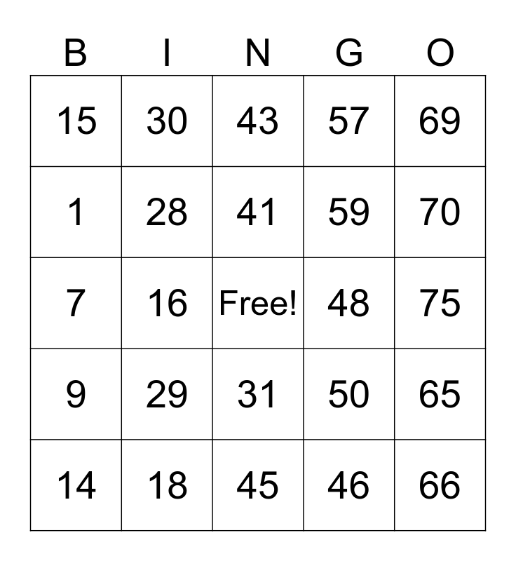 This bingo card has a free space and 24 words: 14, 29, 41, 46, 69, 15, 30, 43, 48, 75, 7, 28, 50, 65, 1, 18, 45, 57, 70, 9, 16, 31, 59 and 66.