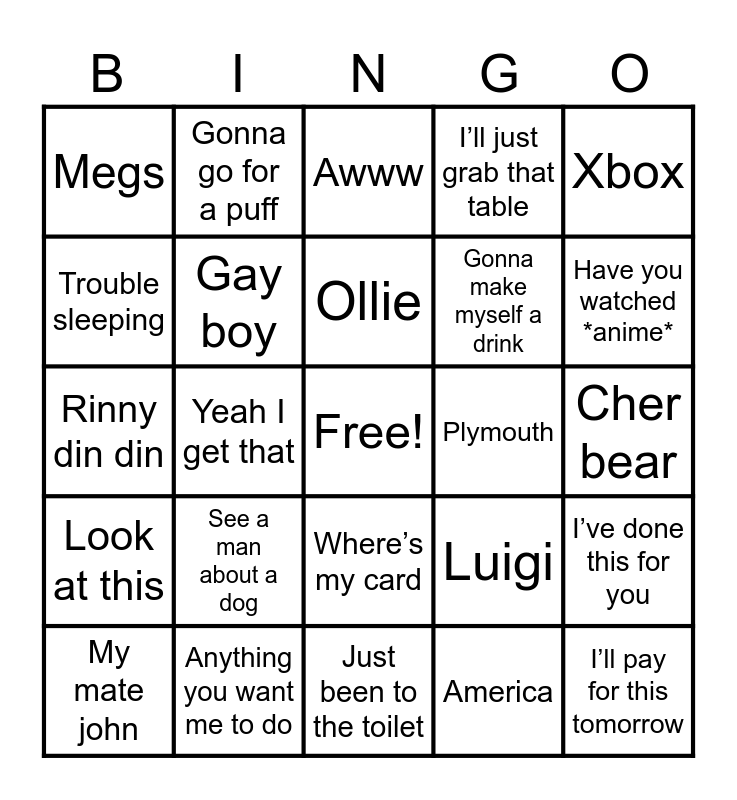 This bingo card has a free space and 24 words: My mate john, See a man about a dog, Ollie, America, Xbox, Megs, Gonna go for a puff, Awww, Plymouth, Cher bear, Rinny din din, Gay boy, Luigi, I’ve done this for you, Trouble sleeping, Anything you want me to do, Just been to the toilet, I’ll just grab that table, Have you watched *anime*, Look at this, Yeah I get that, Where’s my card, Gonna make myself a drink and I’ll pay for this tomorrow.