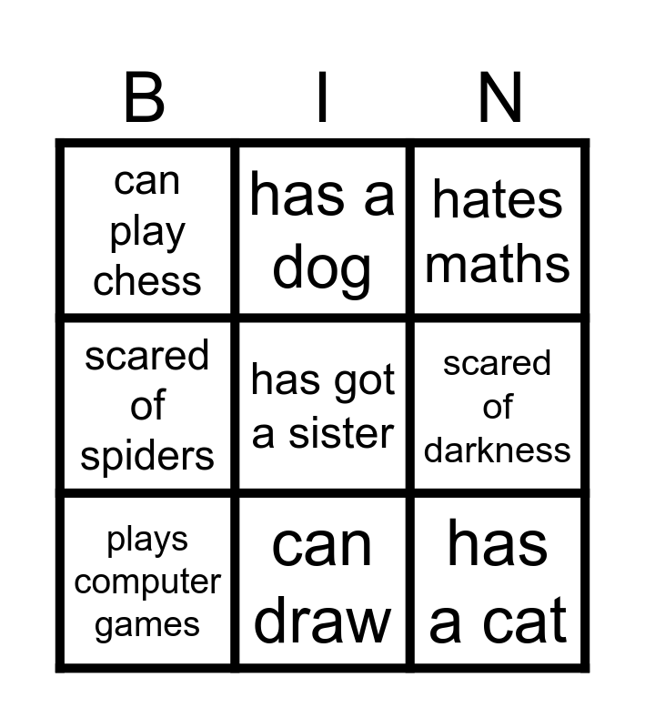 This bingo card has 30 words: plays volleyball, likes swimming, loves pizza, has got a brother, can play chess, hates maths, plays computer games, gets up early, likes English, can speak English, is from Russia, interested in sport, likes horrors, scared of height, visited another country, saw the sea, loves vegetables, hates vegetables, doesn't eat meat, has got a sister, is 13, is in class 8, has a dog, has a cat, scared of darkness, scared of spiders, likes comedies, watches TV, can draw and doesn't cook.