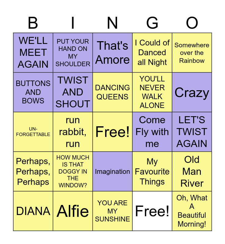This bingo card has a free space and 25 words: HOW MUCH IS THAT DOGGY IN THE WINDOW?, YOU ARE MY SUNSHINE, DANCING QUEENS, DIANA, Somewhere over the Rainbow, WE'LL MEET AGAIN, BUTTONS AND BOWS, PUT YOUR HAND ON MY SHOULDER, Come Fly with me, Imagination, YOU'LL NEVER WALK ALONE, UN-FORGETTABLE, My Favourite Things, Old Man River, TWIST AND SHOUT, YMCA, LET'S TWIST AGAIN, That's Amore, Crazy, run rabbit, run, Oh, What A Beautiful Morning!, Alfie, Perhaps, Perhaps, Perhaps, I Could of Danced all Night and Free!.