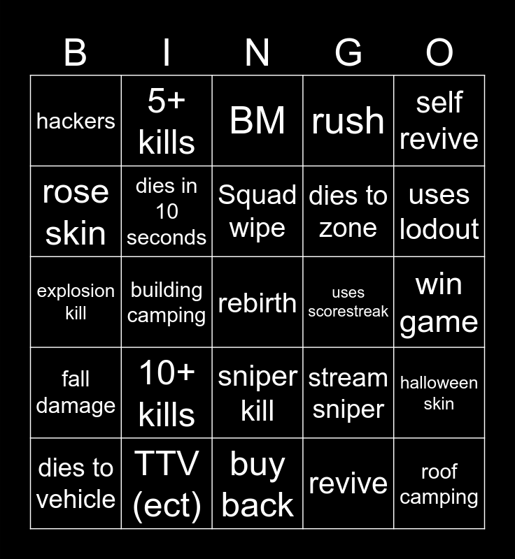 This bingo card has a free space and 24 words: 10+ kills, TTV (ect), Squad wipe, dies to vehicle, self revive, hackers, rose skin, 5+ kills, uses scorestreak, sniper kill, dies to zone, explosion kill, stream sniper, halloween skin, dies in 10 seconds, revive, win game, BM, uses lodout, building camping, roof camping, fall damage, rush and buy back.