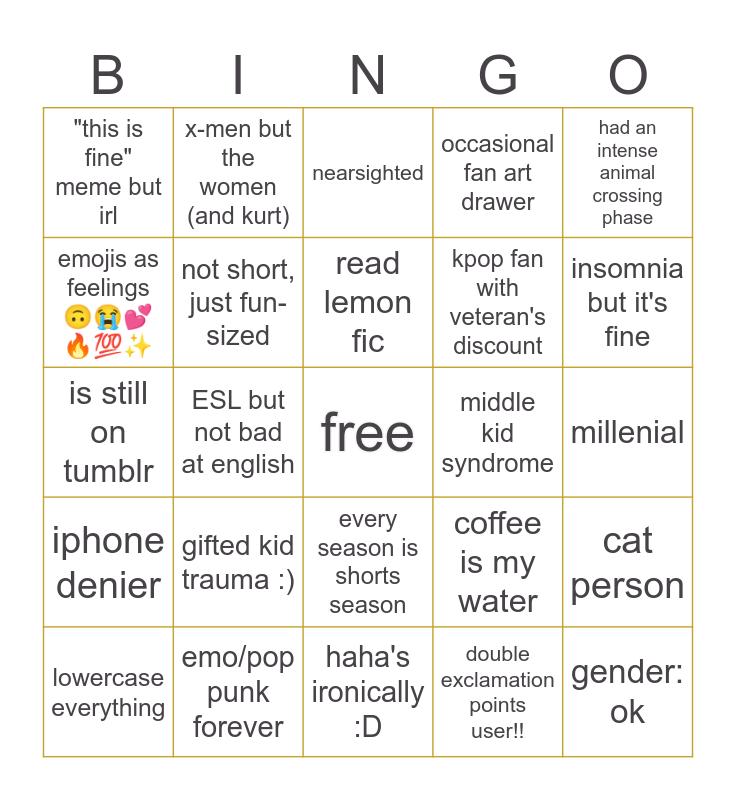 This bingo card has a free space and 24 words: gifted kid trauma :), emo/pop punk forever, read lemon fic, lowercase everything, had an intense animal crossing phase, "this is fine" meme but irl, emojis as feelings 🙃😭💕🔥💯✨️, x-men but the women (and kurt), middle kid syndrome, every season is shorts season, kpop fan with veteran's discount, is still on tumblr, coffee is my water, cat person, not short, just fun-sized, double exclamation points user!!, millenial, nearsighted, insomnia but it's fine, ESL but not bad at english, gender: ok, iphone denier, occasional fan art drawer and haha's ironically :D.