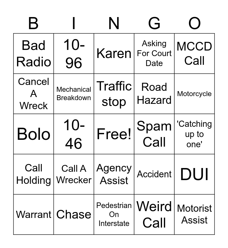 This bingo card has a free space and 24 words: Call A Wrecker, Chase, Traffic stop, Warrant, MCCD Call, Bad Radio, Cancel A Wreck, 10-96, Spam Call, Agency Assist, Road Hazard, Bolo, Accident, DUI, Mechanical Breakdown, Weird Call, 'Catching up to one', Karen, Motorcycle, 10-46, Motorist Assist, Call Holding, Asking For Court Date and Pedestrian On Interstate.