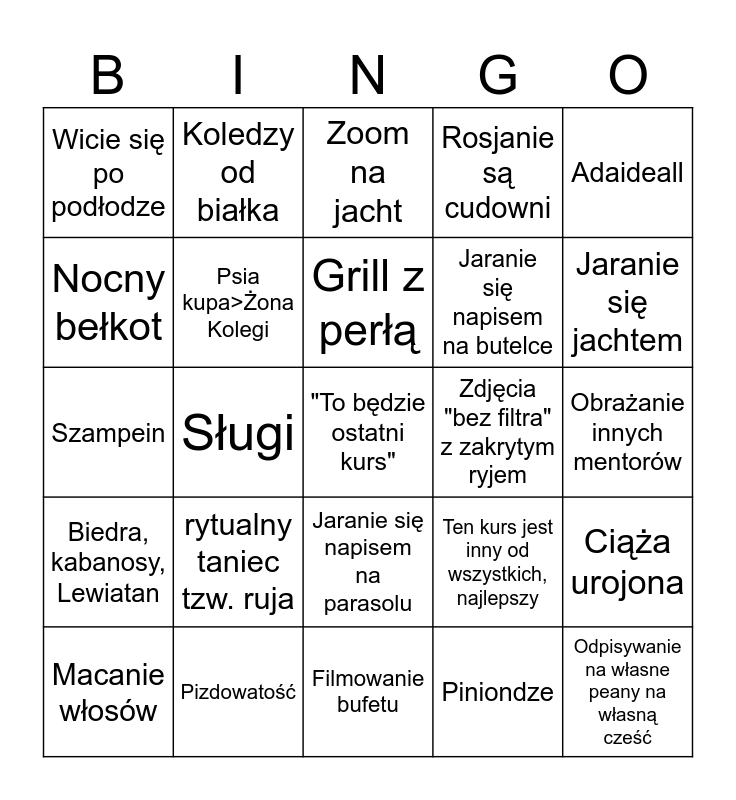This bingo card has a free space and 24 words: rytualny taniec tzw. ruja, Pizdowatość, Grill z perłą, Macanie włosów, Adaideall, Wicie się po podłodze, Nocny bełkot, Koledzy od białka, Zdjęcia "bez filtra" z zakrytym ryjem, Jaranie się napisem na parasolu, Jaranie się napisem na butelce, Szampein, Ten kurs jest inny od wszystkich, najlepszy, Ciąża urojona, Psia kupa>Żona Kolegi, Piniondze, Obrażanie innych mentorów, Zoom na jacht, Jaranie się jachtem, Sługi, Odpisywanie na własne peany na własną cześć, Biedra, kabanosy, Lewiatan, Rosjanie są cudowni and Filmowanie bufetu.