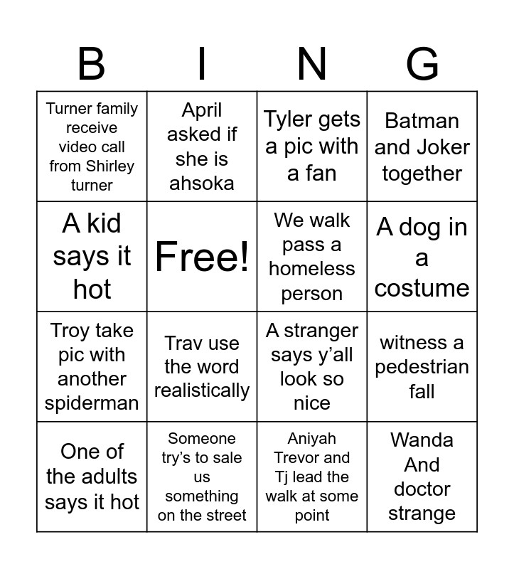 This bingo card has 21 words: Troy take pic with another spiderman, Someone try’s to sale us something on the street, We walk pass a homeless person, Wanda And doctor strange, One of the adults says it hot, April asked if she is ahsoka, Tyler gets a pic with a fan, Batman and Joker together, Turner family receive video call from Shirley turner, Free!, Aniyah Trevor and Tj lead the walk at some point, A dog in a costume, Super car (lambo,ferarri, Bentley,rolls Royce ), Trav use the word realistically, A stranger says y’all look so nice, Police Sighting, A kid says it hot, We see a Lamborghini, witness a pedestrian fall, A stranger ask where were from and One of the kids ask what are we going to eat.