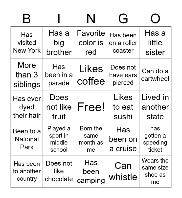 This bingo card has a free space and 30 words: Does not like chocolate, Is left handed, Does not like fruit, Ever had a broken bone, Has visited New York, Favorite color is red, Has been in a parade, Born the same month as me, Likes to eat sushi, Has been camping, Lived in another state, Wears the same size shoe as me, Can whistle, Does not have a passport, Can do a cartwheel, Can play a musical instrument, Has been on a cruise, Been to a National Park, Played a sport in middle school, Has a little sister, Has ever dyed their hair, Likes a superhero, Has a big brother, Does not have ears pierced, More than 3 siblings, Has been on a roller coaster, has gotten a speeding ticket, Has been to another country, Likes coffee and Can roll your tongue.