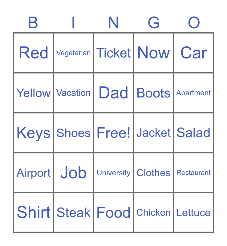 This bingo card has a free space and 29 words: Shirt, Money, Shoes, Sick, Red, Ticket, Vacation, Job, Jacket, Steak, Salad, Lettuce, Food, Chicken, Apartment, Passport, University, Airport, Car, Keys, Clothes, Dress, Boots, Yellow, Now, Vegetarian, Restaurant, Dad and Mom.
