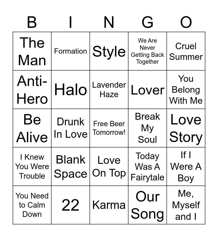 This bingo card has a free space and 39 words: Shake It Off, Single Ladies (Put a Ring on It), Bad Blood, Halo, You Need to Calm Down, Love On Top, Lavender Haze, Run the World (Girls), Cruel Summer, I Knew You Were Trouble, Drunk In Love, We Are Never Getting Back Together, Me, Myself and I, Love Story, Break My Soul, Blank Space, Naughty Girl, The Man, Irreplaceable, Today Was A Fairytale, Anti-Hero, Karma, Lover, You Belong With Me, Willow, marjorie, evermore, Cuff It, Red, Formation, cardigan, Wildest Dream, Style, 22, Our Song, Mine, If I Were A Boy, Be Alive and All Night.