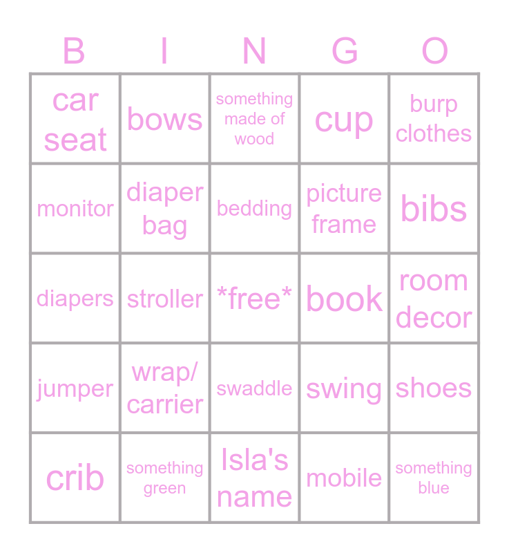This bingo card has a free space and 64 words: onesie, binky, bottles, shoes, wipes, gift card, bows, blanket, bedding, hat, swaddle, socks, room decor, burp clothes, stuffed animal, monitor, stroller, car seat, playpen, picture frame, wrap/ carrier, jumper, cup, breast pump, toy, spoons, teethers, pajamas, dress, lotion, bowl, piggy bank, rattle, bouncy chair, bibs, crib, playmat, mobile, hooded towel, diaper bag, diapers, book, something pink, something grey, something yellow, something blue, something green, something purple, swing, diaper cream, something for Ally, something for Dan, Isla's name, organization, high chair, boppy, something made of wood, sound machine, something with clouds, changing pad, night light, cash, baby bath and memory book.