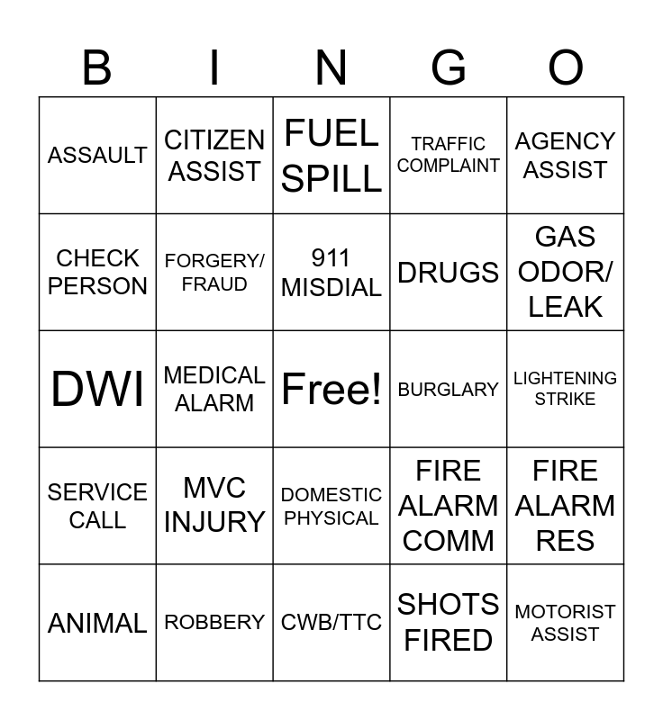 This bingo card has a free space and 25 words: MVC INJURY, CWB/TTC, 911 MISDIAL, ANIMAL, AGENCY ASSIST, ASSAULT, CHECK PERSON, CITIZEN ASSIST, BURGLARY, DOMESTIC PHYSICAL, DRUGS, DWI, FIRE ALARM COMM, FIRE ALARM RES, FORGERY/ FRAUD, HAZMAT, LIGHTENING STRIKE, FUEL SPILL, GAS ODOR/ LEAK, MEDICAL ALARM, MOTORIST ASSIST, ROBBERY, SERVICE CALL, TRAFFIC COMPLAINT and SHOTS FIRED.