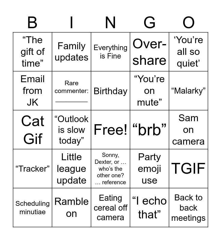 This bingo card has a free space and 49 words: Fustrated, Back to back meetings, Frozen screen, Eating cereal off camera, Little league update, At least two pets onscreen, Family updates, weather update, Email from JK, “folks” email, Rare commenter: _________, Over-share, TGIF, Party emoji use, Unexpected message from someone outside our unit, Celebrity RIP, Birthday, “brb”, Themed run of gifs (i.e. 3+ office, adelle Barbie gifs etc), ‘You’re all so quiet’, “Outlook is slow today”, “I echo that”, “The gift of time”, “You’re on mute”, Idiom aka Bryanism, “Malarky”, Scheduling minutiae, Youtube link to a song, Sonny, Dexter, or … who’s the other one? … reference, “Tracker”, Meeting about meetings, Meta guy (gender neutral), Random f*ckery, RC style, “Co-create”, Ramble on, pregnancy/baby talk, Losing cool, Unnecessary insertion, Sam on camera, Yawn, Photo post, Chris Farley GIF, The Office GIF, Schitts Creek Gif, Cat Gif, Everything is Fine, Screenshare, Blurry face and waiting on DD or CA.