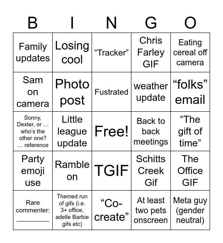 This bingo card has a free space and 49 words: Meeting about meetings, Meta guy (gender neutral), Random f*ckery, RC style, “Co-create”, Ramble on, pregnancy/baby talk, Losing cool, Unnecessary insertion, Sam on camera, Yawn, Photo post, Chris Farley GIF, The Office GIF, Schitts Creek Gif, Cat Gif, Everything is Fine, Fustrated, Back to back meetings, Frozen screen, Eating cereal off camera, Little league update, At least two pets onscreen, Family updates, weather update, Email from JK, “folks” email, Rare commenter: _________, Over-share, TGIF, Party emoji use, Unexpected message from someone outside our unit, Celebrity RIP, Birthday, “brb”, Themed run of gifs (i.e. 3+ office, adelle Barbie gifs etc), ‘You’re all so quiet’, “Outlook is slow today”, “I echo that”, “The gift of time”, “You’re on mute”, Idiom aka Bryanism, “Malarky”, Scheduling minutiae, Youtube link to a song, Sonny, Dexter, or … who’s the other one? … reference, “Tracker”, Screenshare, Blurry face and waiting on DD or CA.
