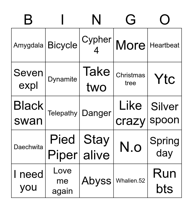 This bingo card has a free space and 24 words: Pied Piper, Love me again, Take two, I need you, Heartbeat, Amygdala, Seven expl, Bicycle, Like crazy, Stay alive, Christmas tree, Black swan, N.o, Spring day, Dynamite, Whalien.52, Silver spoon, Cypher 4, Ytc, Telepathy, Run bts, Daechwita, More and Abyss.