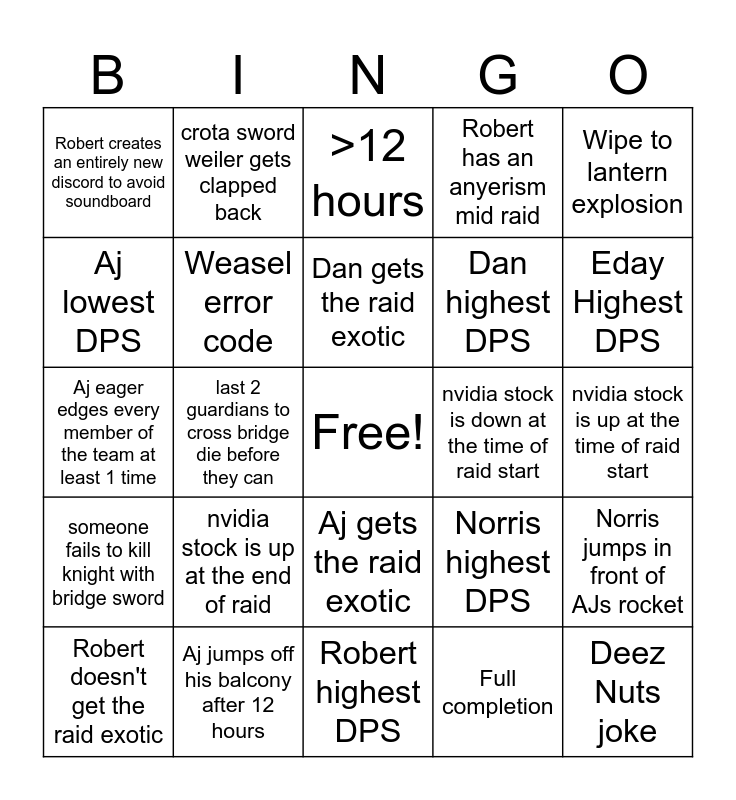 This bingo card has a free space and 39 words: Robert has to take a work call, Norris loses power due to hurricane, Edays Xbox gets unplugged, Weasel error code, Robert doesn't get the raid exotic, Aj gets the raid exotic, Dan gets the raid exotic, Norris gets the raid exotic, Wipe to lantern explosion, someone fails to kill knight with bridge sword, last 2 guardians to cross bridge die before they can, Robert has an anyerism mid raid, Deez Nuts joke, nvidia stock is up at the time of raid start, nvidia stock is down at the time of raid start, nvidia stock is up at the end of raid, nvidia stock is down at the end of raid, Robert creates an entirely new discord to avoid soundboard, "alright guys lets watch this video of the encounter real quick", Norris highest DPS, Aj lowest DPS, Robert highest DPS, Dan highest DPS, Eday Highest DPS, Scotty highest DPS, no one secures the extra chest through the barrier door, Norris secures the extra chest through the barrier door, Team wipes to death song, chalice of light mechanic changed, crota sword weiler gets clapped back, team wipe to oversoul mechanic, first run flawless, >12 hours, Aj jumps off his balcony after 12 hours, Full completion, Challenge mode completion, Norris jumps in front of AJs rocket, Aj eager edges every member of the team at least 1 time and Aj gets eager edged once by every member besides himself.