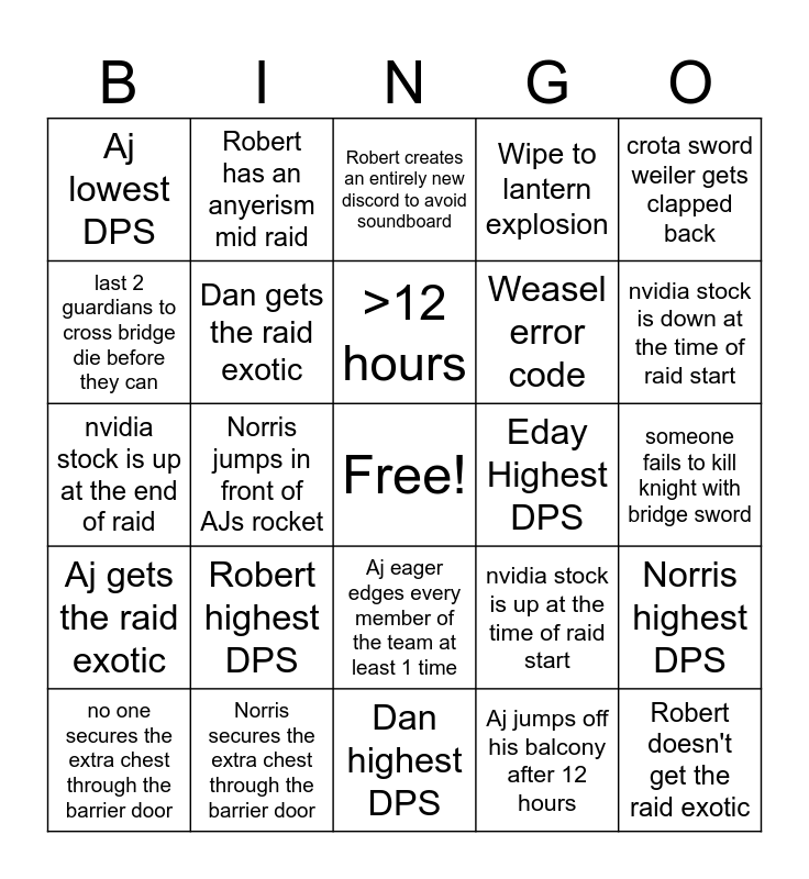 This bingo card has a free space and 39 words: Robert has to take a work call, Norris loses power due to hurricane, Edays Xbox gets unplugged, Weasel error code, Robert doesn't get the raid exotic, Aj gets the raid exotic, Dan gets the raid exotic, Norris gets the raid exotic, Wipe to lantern explosion, someone fails to kill knight with bridge sword, last 2 guardians to cross bridge die before they can, Robert has an anyerism mid raid, Deez Nuts joke, nvidia stock is up at the time of raid start, nvidia stock is down at the time of raid start, nvidia stock is up at the end of raid, nvidia stock is down at the end of raid, Robert creates an entirely new discord to avoid soundboard, "alright guys lets watch this video of the encounter real quick", Norris highest DPS, Aj lowest DPS, Robert highest DPS, Dan highest DPS, Eday Highest DPS, Scotty highest DPS, no one secures the extra chest through the barrier door, Norris secures the extra chest through the barrier door, Team wipes to death song, chalice of light mechanic changed, crota sword weiler gets clapped back, team wipe to oversoul mechanic, first run flawless, >12 hours, Aj jumps off his balcony after 12 hours, Full completion, Challenge mode completion, Norris jumps in front of AJs rocket, Aj eager edges every member of the team at least 1 time and Aj gets eager edged once by every member besides himself.
