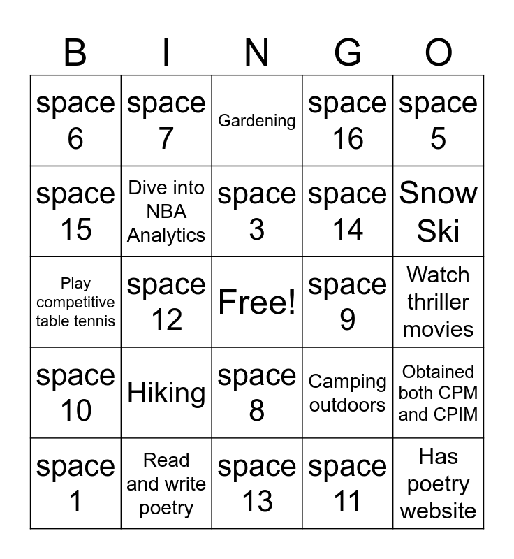 This bingo card has a free space and 30 words: space 1, space 2, space 3, space 4, space 5, space 6, space 7, space 8, space 9, Has poetry website, space 10, Dive into NBA Analytics, I am a foodie, space 11, Obtained both CPM and CPIM, Enjoy Dungeons & Dragons, space 12, space 13, Camping outdoors, Snow Ski, Play competitive table tennis, Read and write poetry, Gardening, space 14, Watch thriller movies, space 15, Hiking, ESPN sports junkie, space 16 and space 17.