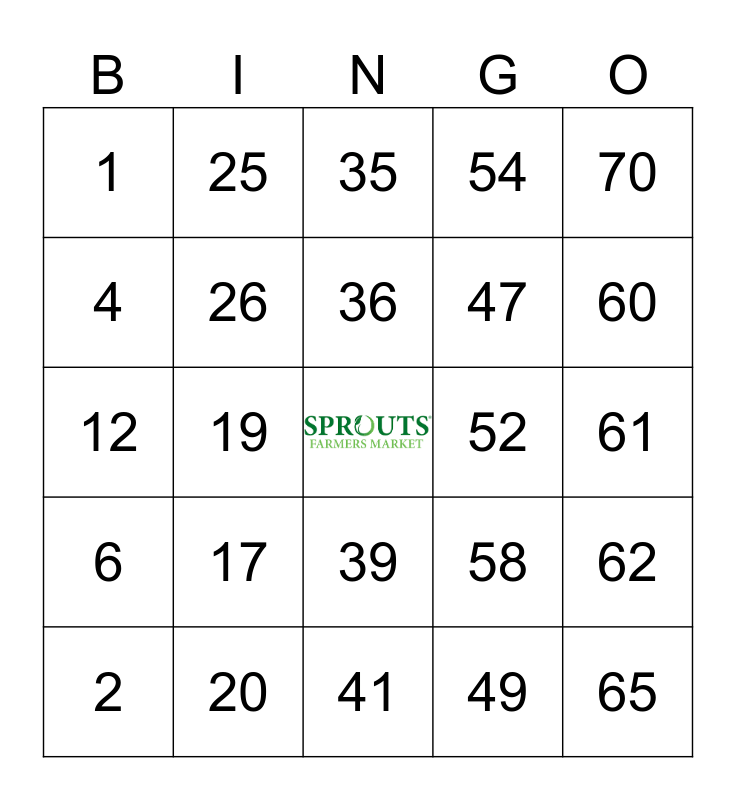 This bingo card has a free space and 24 words: 2, 17, 36, 49, 70, 1, 25, 35, 52, 61, 12, 26, 58, 62, 4, 20, 41, 54, 60, 6, 19, 39, 47 and 65.
