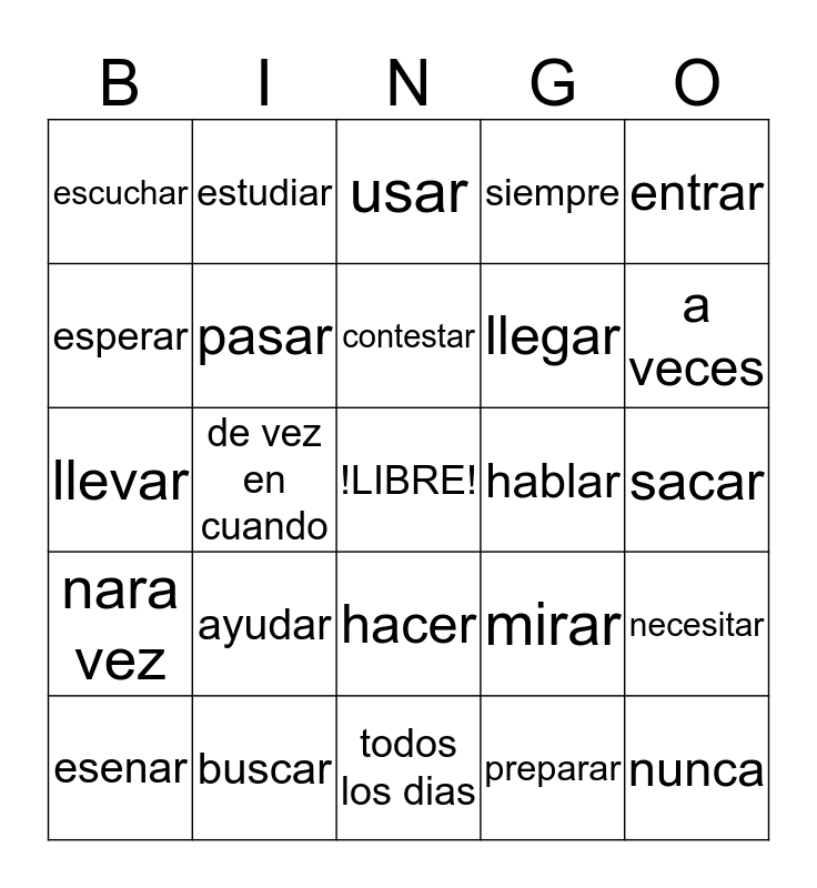 This bingo card has a free space and 24 words: ayudar, buscar, contestar, esenar, entrar, escuchar, esperar, estudiar, hablar, hacer, llegar, llevar, mirar, necesitar, pasar, preparar, sacar, usar, a veces, de vez en cuando, nunca, nara vez, siempre and todos los dias.
