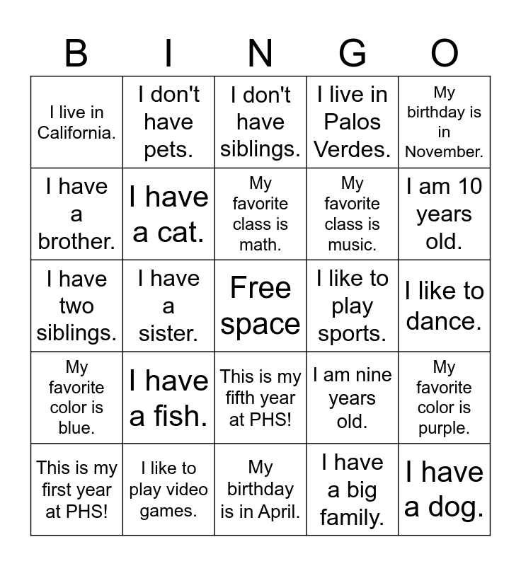 This bingo card has a free space and 24 words: I have a fish., I like to play video games., My favorite class is math., This is my first year at PHS!, My birthday is in November., I live in California., I have a brother., I don't have pets., I like to play sports., This is my fifth year at PHS!, My favorite class is music., I have two siblings., I am nine years old., My favorite color is purple., I have a cat., I have a big family., I like to dance., I don't have siblings., I am 10 years old., I have a sister., I have a dog., My favorite color is blue., I live in Palos Verdes. and My birthday is in April..