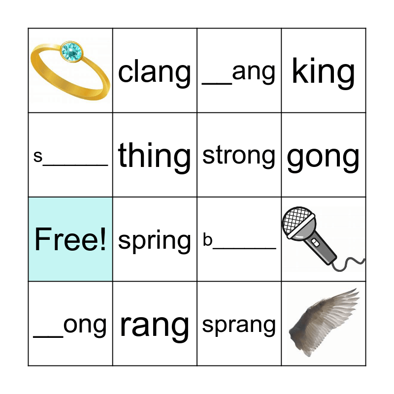 This bingo card has 3 images and 17 words: lung, __ang, bring, __ong, s______, rang, Free!, clang, spring, b______, thing, strong, ___ung, gong, king, sprang and hung.