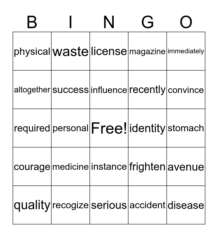 This bingo card has a free space and 24 words: medicine, recogize, influence, quality, immediately, physical, altogether, waste, identity, instance, recently, required, frighten, avenue, success, accident, stomach, license, convince, personal, disease, courage, magazine and serious.