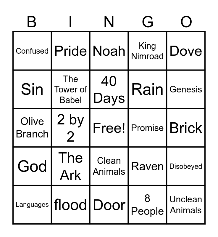 This bingo card has a free space and 25 words: The Ark, Door, 40 Days, Languages, Dove, Confused, Sin, Pride, Promise, Clean Animals, Rain, Olive Branch, Raven, Disobeyed, The Tower of Babel, Mount Ararat, Brick, Noah, Genesis, 2 by 2, Unclean Animals, flood, God, King Nimroad and 8 People.
