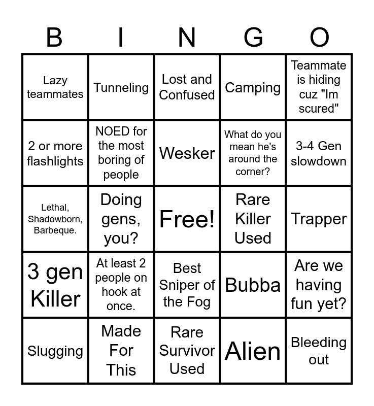 This bingo card has a free space and 24 words: Slugging, At least 2 people on hook at once., Wesker, Alien, Teammate is hiding cuz "Im scured", Lazy teammates, Tunneling, Lost and Confused, Rare Killer Used, Trapper, Lethal, Shadowborn, Barbeque., NOED for the most boring of people, Bubba, Are we having fun yet?, 2 or more flashlights, Made For This, Rare Survivor Used, Camping, 3-4 Gen slowdown, 3 gen Killer, Doing gens, you?, Best Sniper of the Fog, What do you mean he's around the corner? and Bleeding out.