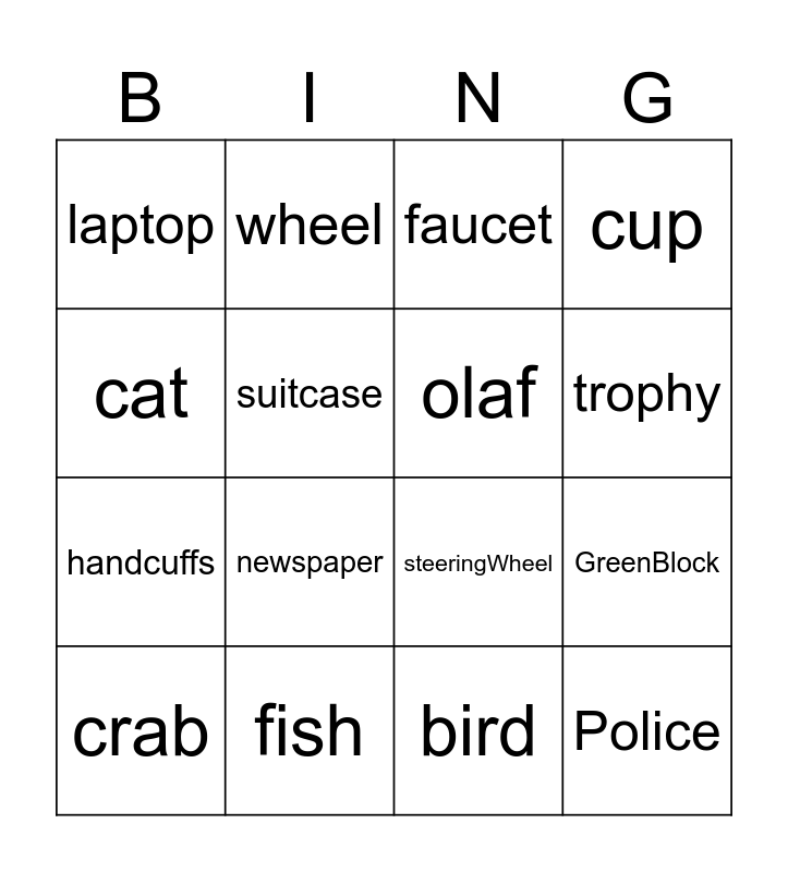 This bingo card has 32 words: Free!, RedBlock, GreenBlock, OrangeBlock, Police, olaf, cat, dog, wheel, OrangeCone, trophy, faucet, bed, candle, fish, jewels, crossaint, steeringWheel, chair, flowerPot, moble, comb, bird, popscicle, crab, cup, handcuffs, suitcase, laptop, helmet, broom and newspaper.