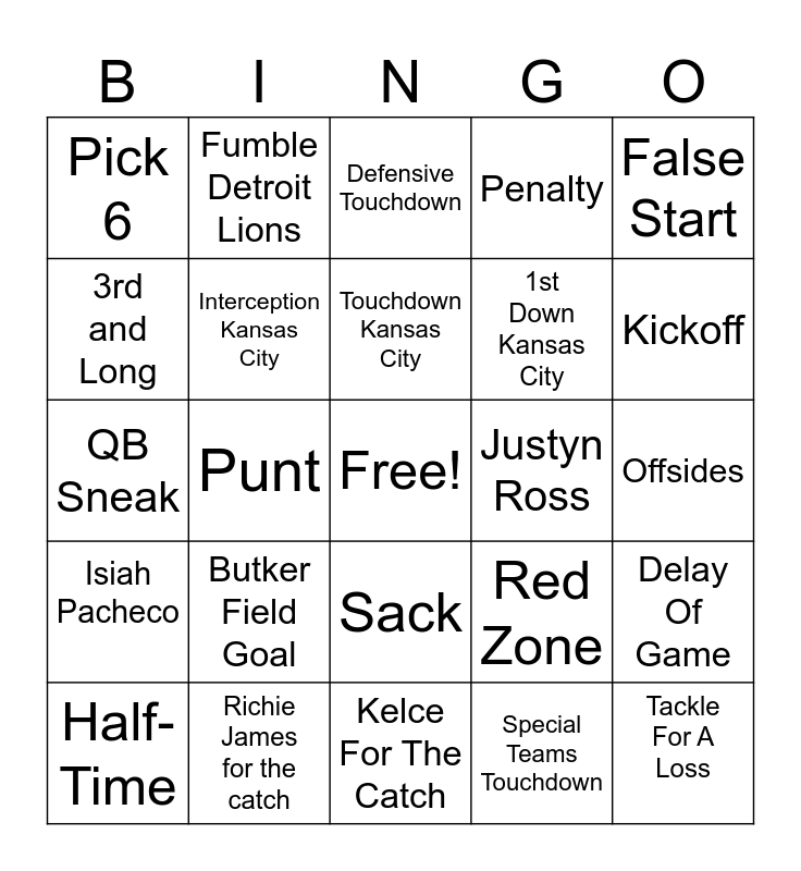 This bingo card has a free space and 25 words: Butker Field Goal, Kelce For The Catch, Touchdown Kansas City, Half-Time, False Start, Pick 6, 3rd and Long, Fumble Detroit Lions, Justyn Ross, Sack, 1st Down Kansas City, QB Sneak, Red Zone, Delay Of Game, Interception Kansas City, 4th and Inches, Offsides, Defensive Touchdown, Kickoff, Punt, Tackle For A Loss, Richie James for the catch, Isiah Pacheco, Penalty and Special Teams Touchdown.
