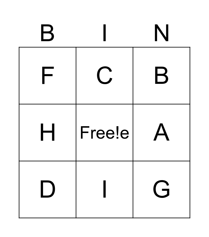 This bingo card has a free space and 8 words: A, B, C, D, F, G, H and I.