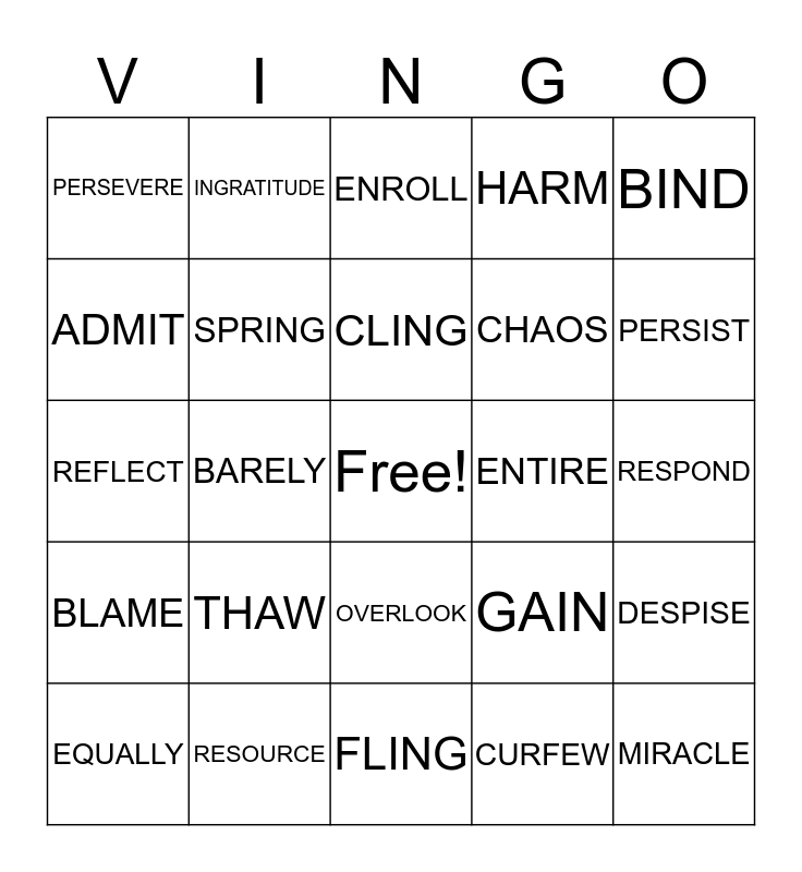 This bingo card has a free space and 24 words: THAW, RESOURCE, CLING, EQUALLY, BIND, PERSEVERE, ADMIT, INGRATITUDE, ENTIRE, OVERLOOK, CHAOS, REFLECT, GAIN, DESPISE, SPRING, CURFEW, RESPOND, ENROLL, PERSIST, BARELY, MIRACLE, BLAME, HARM and FLING.