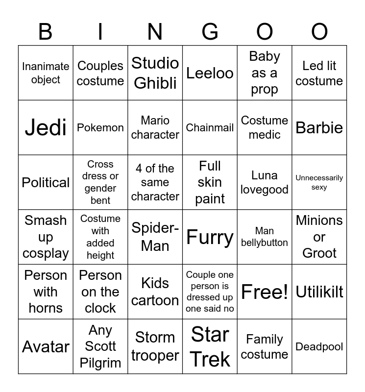 This bingo card has 37 words: Free!, Couple one person is dressed up one said no, Family costume, Jedi, Costume with added height, Luna lovegood, Pokemon, Star Trek, Baby as a prop, Avatar, Barbie, Leeloo, Political, 4 of the same character, Led lit costume, Full skin paint, Person on the clock, Studio Ghibli, Unnecessarily sexy, Cross dress or gender bent, Inanimate object, Chainmail, Spider-Man, Man bellybutton, Any Scott Pilgrim, Minions or Groot, Couples costume, Storm trooper, Utilikilt, Kids cartoon, Zombified, Furry, Costume medic, Person with horns, Smash up cosplay, Mario character and Deadpool.