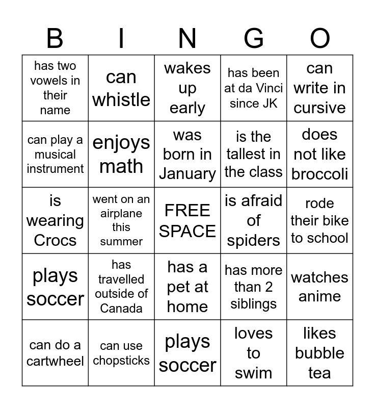 This bingo card has a free space and 24 words: has travelled outside of Canada, can use chopsticks, was born in January, can do a cartwheel, can write in cursive, has two vowels in their name, can play a musical instrument, can whistle, is afraid of spiders, has a pet at home, is the tallest in the class, is wearing Crocs, has more than 2 siblings, watches anime, enjoys math, loves to swim, rode their bike to school, wakes up early, does not like broccoli, went on an airplane this summer, likes bubble tea, plays soccer, has been at da Vinci since JK and plays soccer.
