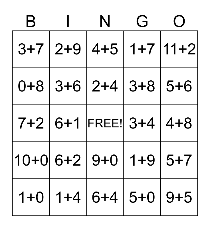 This bingo card has a free space and 27 words: 1+9, 5+3, 3+8, 6+4, 0+8, 4+5, 2+9, 10+0, 3+4, 5+7, 7+2, 1+7, 1+0, 1+4, 5+6, 8+1, 3+6, 2+4, 6+2, 3+7, 4+8, 5+0, 6+1, 9+5, 9+0, 11+2 and 13+0.