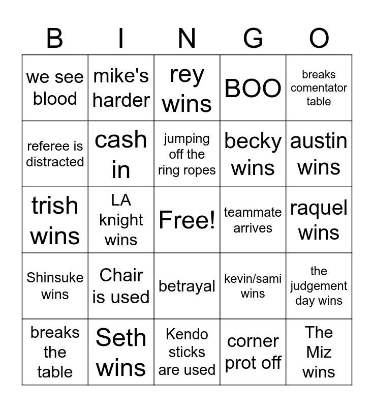 This bingo card has a free space and 25 words: Chair is used, Kendo sticks are used, jumping off the ring ropes, breaks the table, breaks comentator table, we see blood, referee is distracted, mike's harder, teammate arrives, betrayal, becky wins, trish wins, kevin/sami wins, the judgement day wins, cash in, rhea ripley wins, raquel wins, rey wins, austin wins, LA knight wins, The Miz wins, Seth wins, Shinsuke wins, BOO and corner prot off.